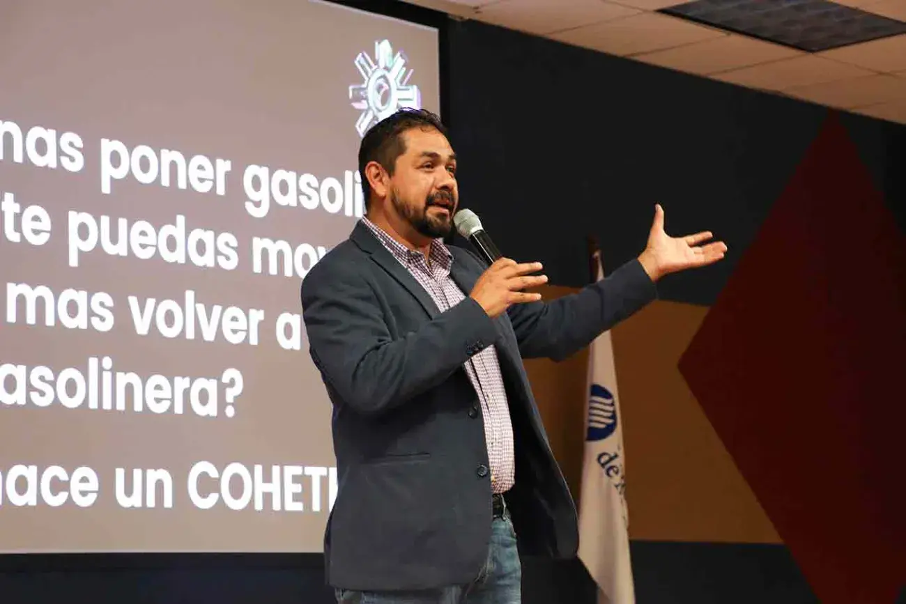 Durante la conferencia “Física de los cohetes”, el físico Marcos Gómez expuso los cálculos requeridos para el lanzamiento de cohetes y destacó que son cruciales para el éxito de las misiones espaciales.